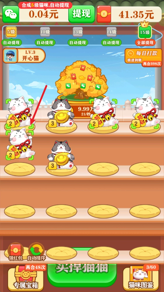 2、把相同的猫咪拖动到一起重叠,就能合成出更高级的猫咪。