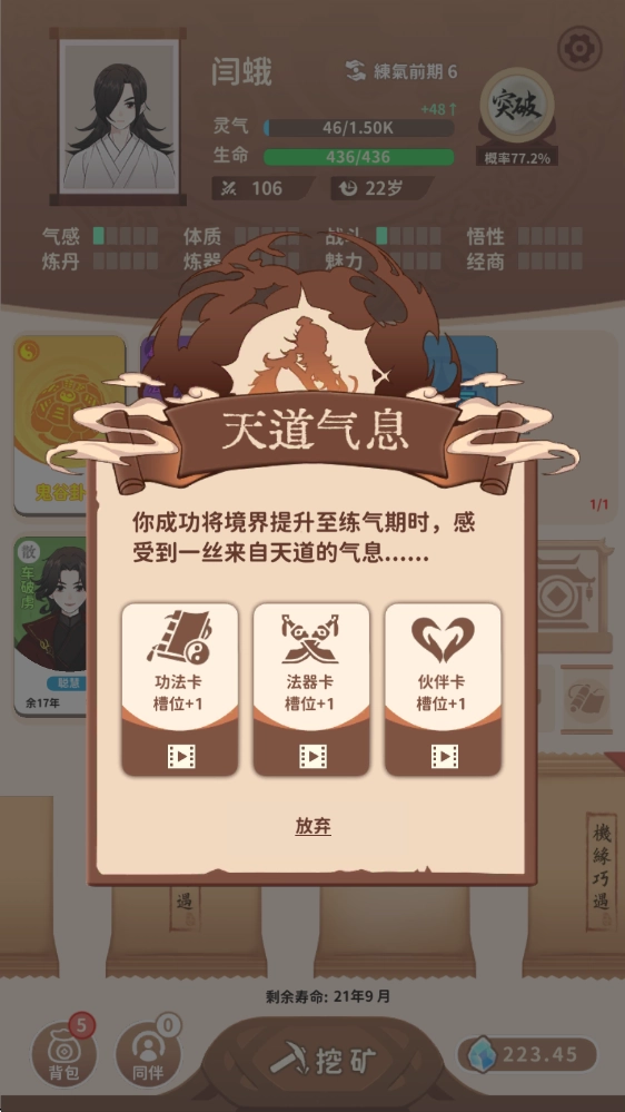 6、突破过程中还会随机触发各类事件,像这里出现的天道气息就是其中一种。