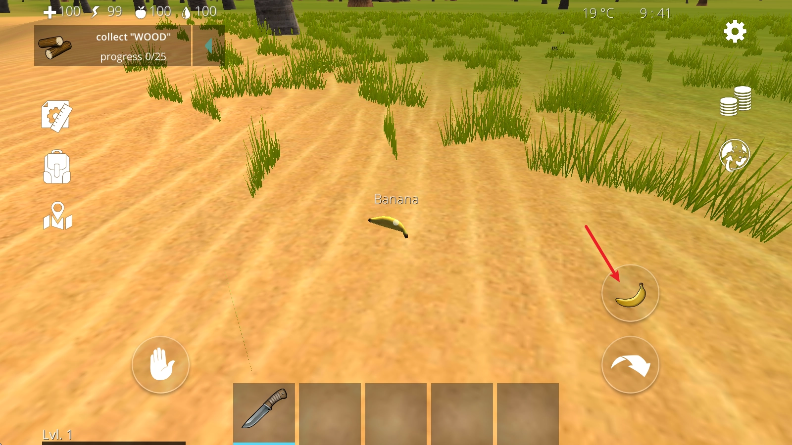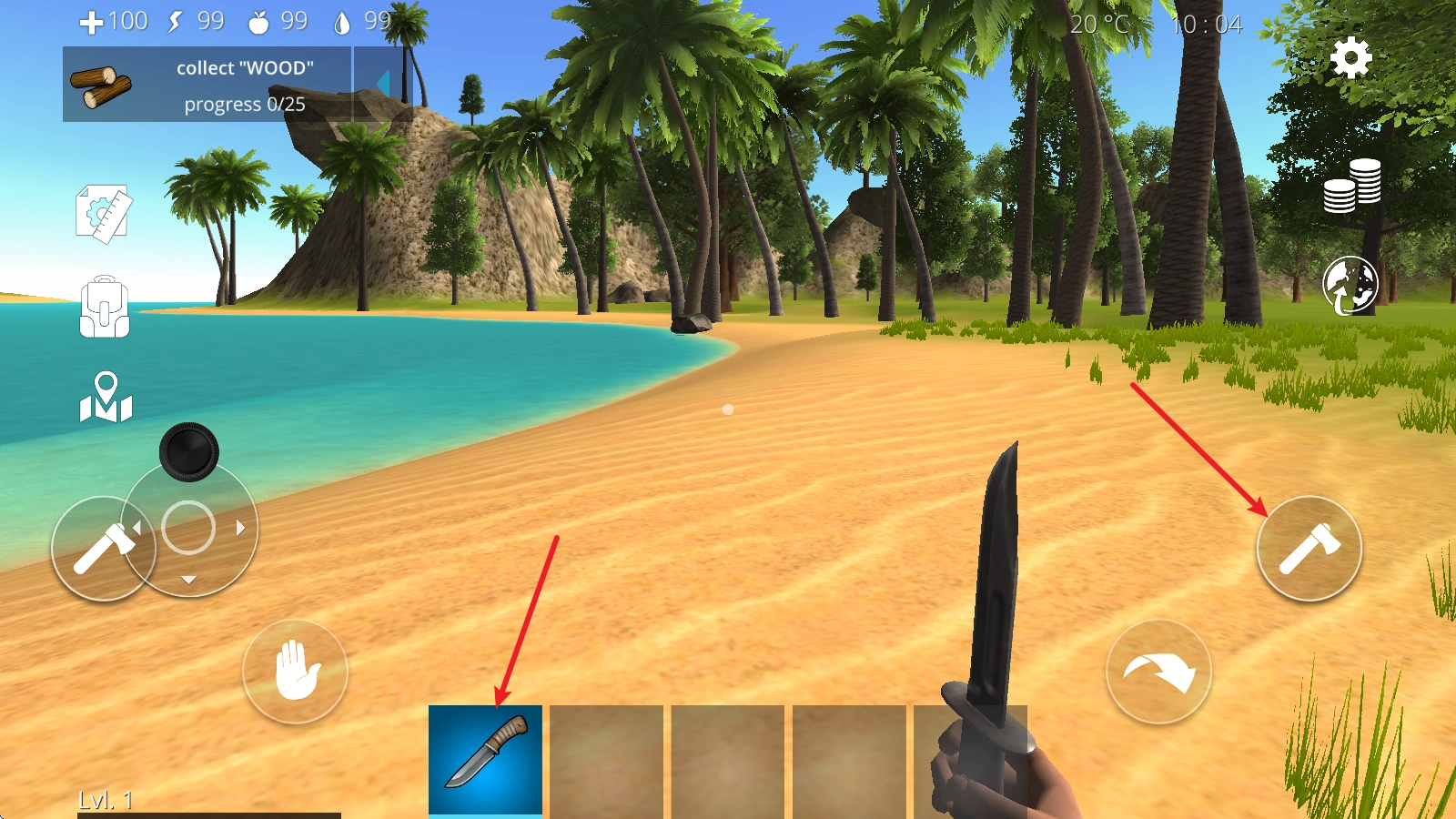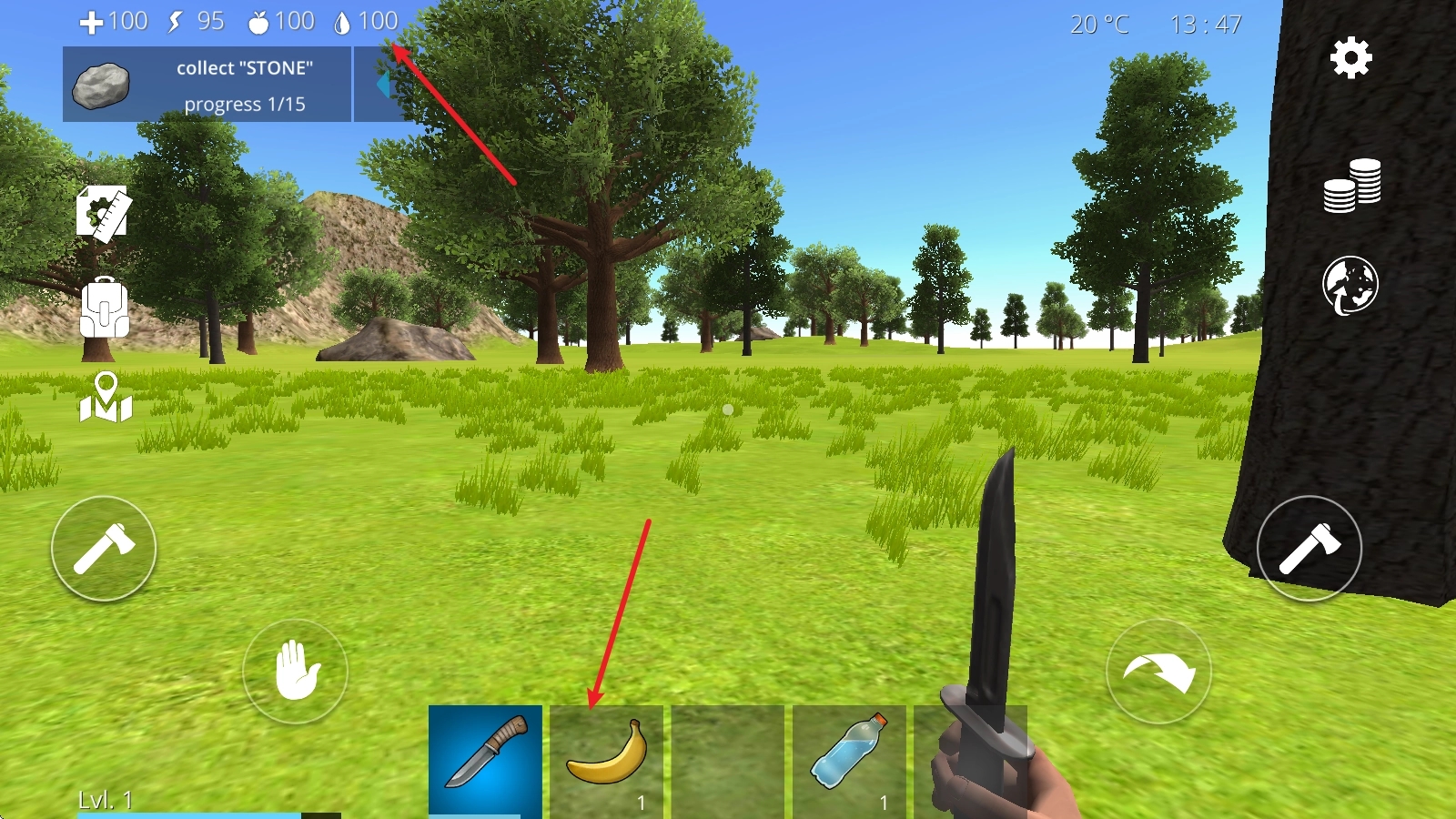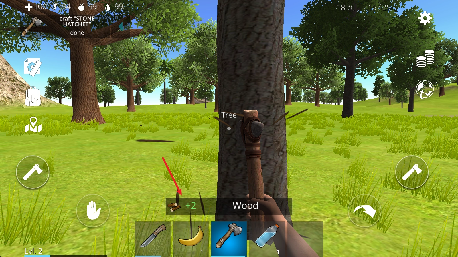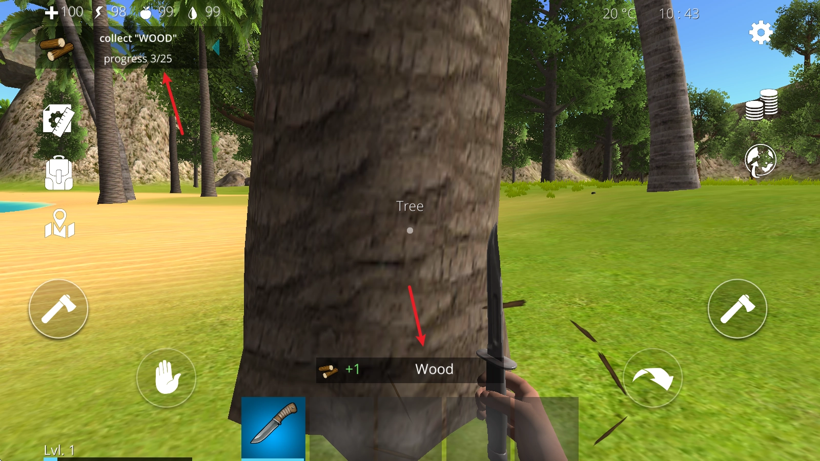 4、举个例子,当我们拿出小刀后,对准树木就能获取树木资源,同时也能完成左上角显示的任务。