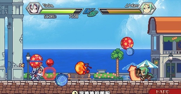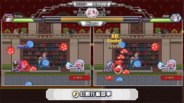在困难难度下,敌人的攻击频率会变得很快,球的数量也会增多。红蓝双色弹力球有时会叠加着投掷过来,有时则是一快一慢地出现,再加上连续发射的火焰球,想要拿到Great或Good的判定还算容易,但大部分时候都会判定为Miss。这不仅会让人看得眼花缭乱,玩起来也会有些手忙脚乱。