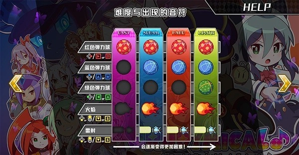 选择简单难度游玩时,只有红色弹力球会朝玩家袭来,操作只需按一个键即可,但仍需注意争取全部Perfect判定和全连Combo——要是出现几次Great或Good判定,最终评价最多只能到B级,而A级以下无法获取魔晶矿,等于白白浪费了游玩时间。