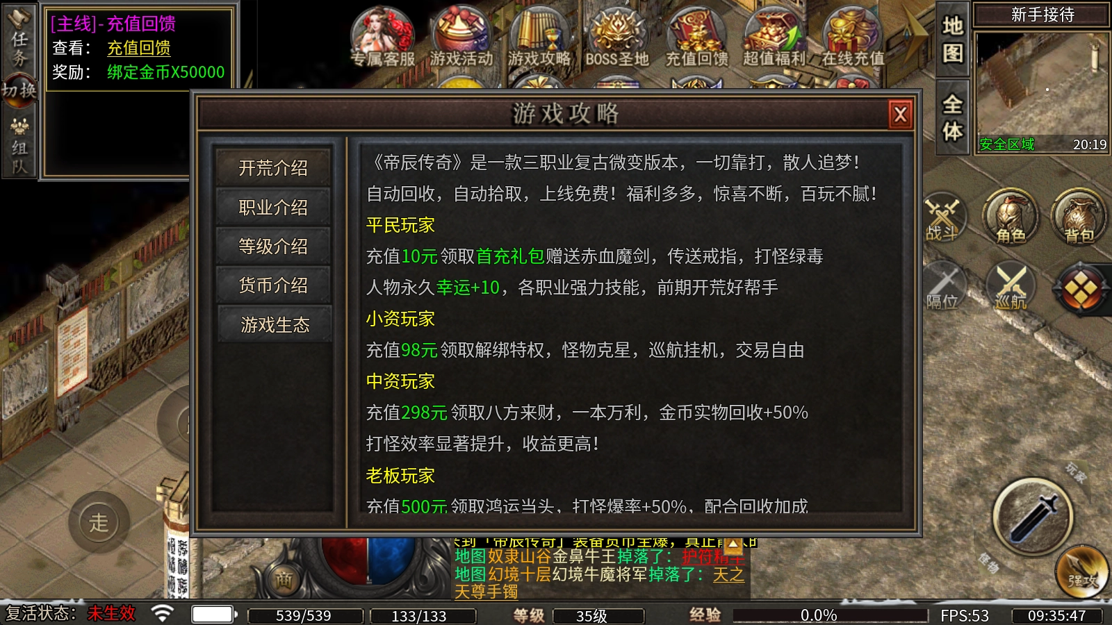 1、平民玩家:仅需充值10元即可领取首充礼包,内含赤血魔剑、传送戒指,还能获得打怪绿毒效果、人物永久幸运+10,以及各职业强力技能,是前期开荒的得力助手。