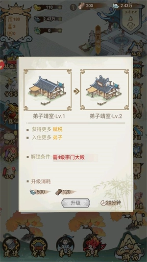 5、消耗银两与材料可升级建筑,持续提升宗门等级,打造出最出色的宗门。