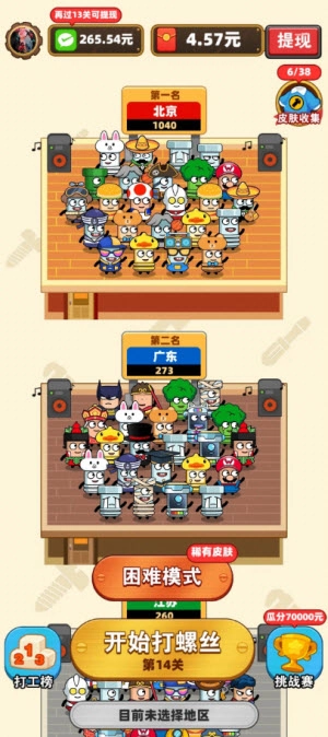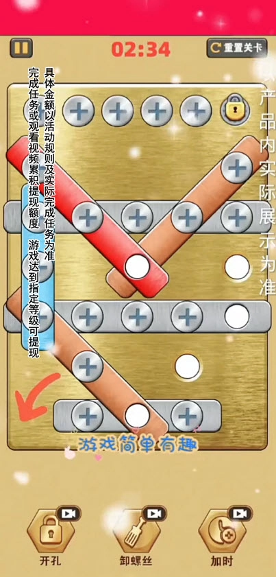 进厂打螺丝是一款消除类小游戏。游戏中,玩家需要把一颗颗螺丝全部卸下来,看似简单,实际操作起来难度不小。一个好的开局至关重要,每一步都得仔细思考,不然后续就很难顺利完成。挑战成功后,还能领取奖励和红包呢。