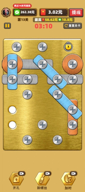 1、每一个广告都不错过,认真打螺丝打到了第14关,提现比例是1%,目前收入总共2.62