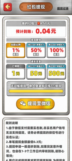 2、要达到50%的提现比例得先通过108关,这可太难做到了!