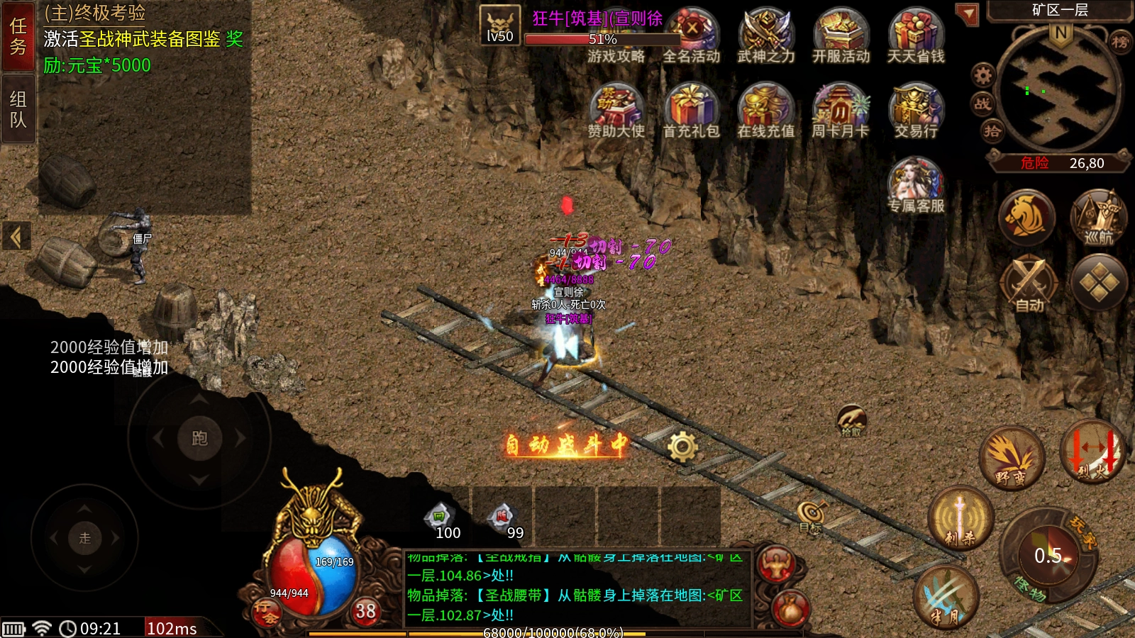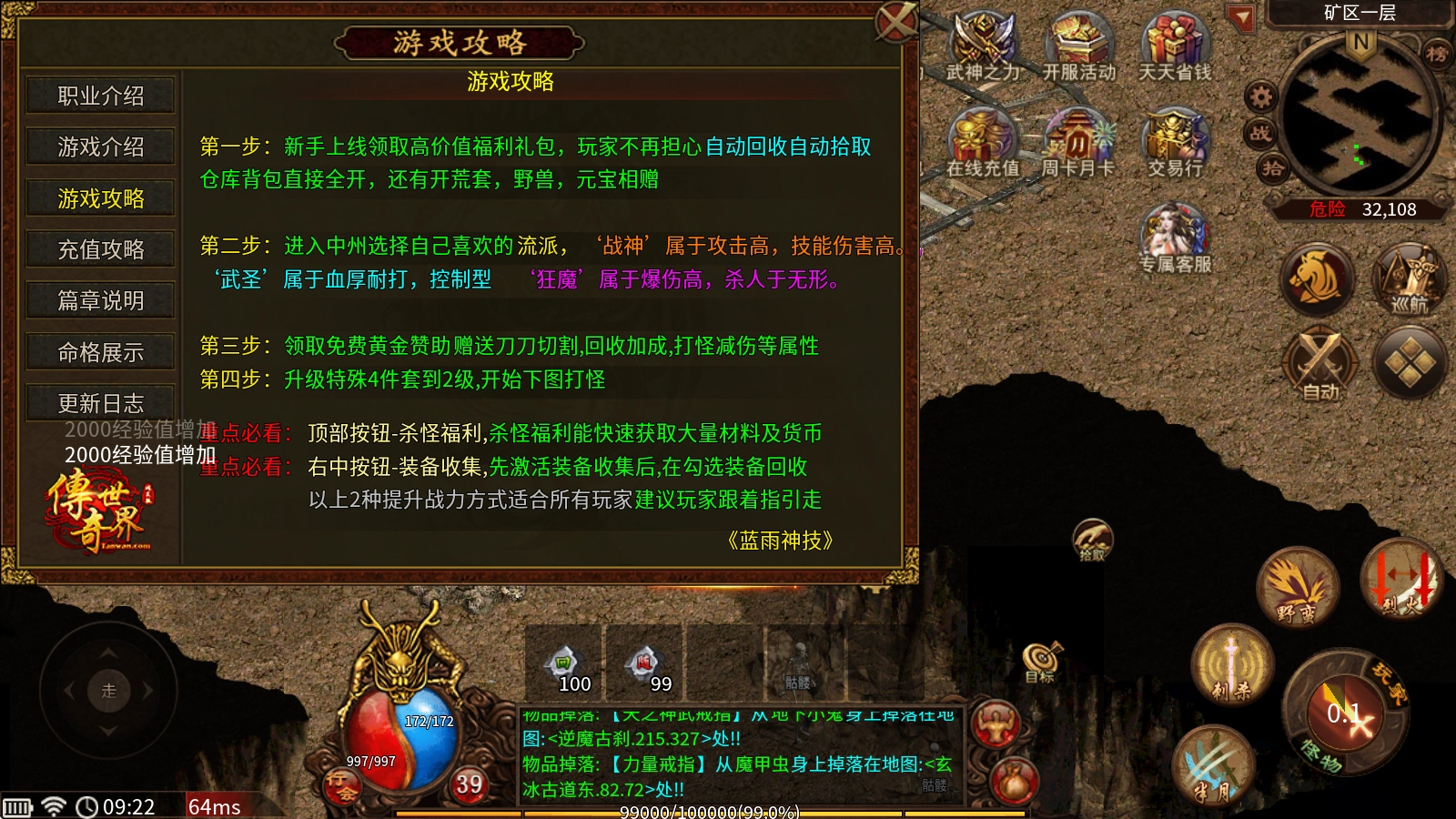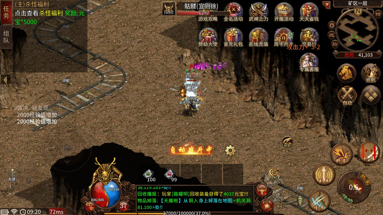 2、杀怪福利、全服首爆、全服首杀、升级奖励等丰富的新手福利助力你快速成长,海量元宝让你拿到手软。