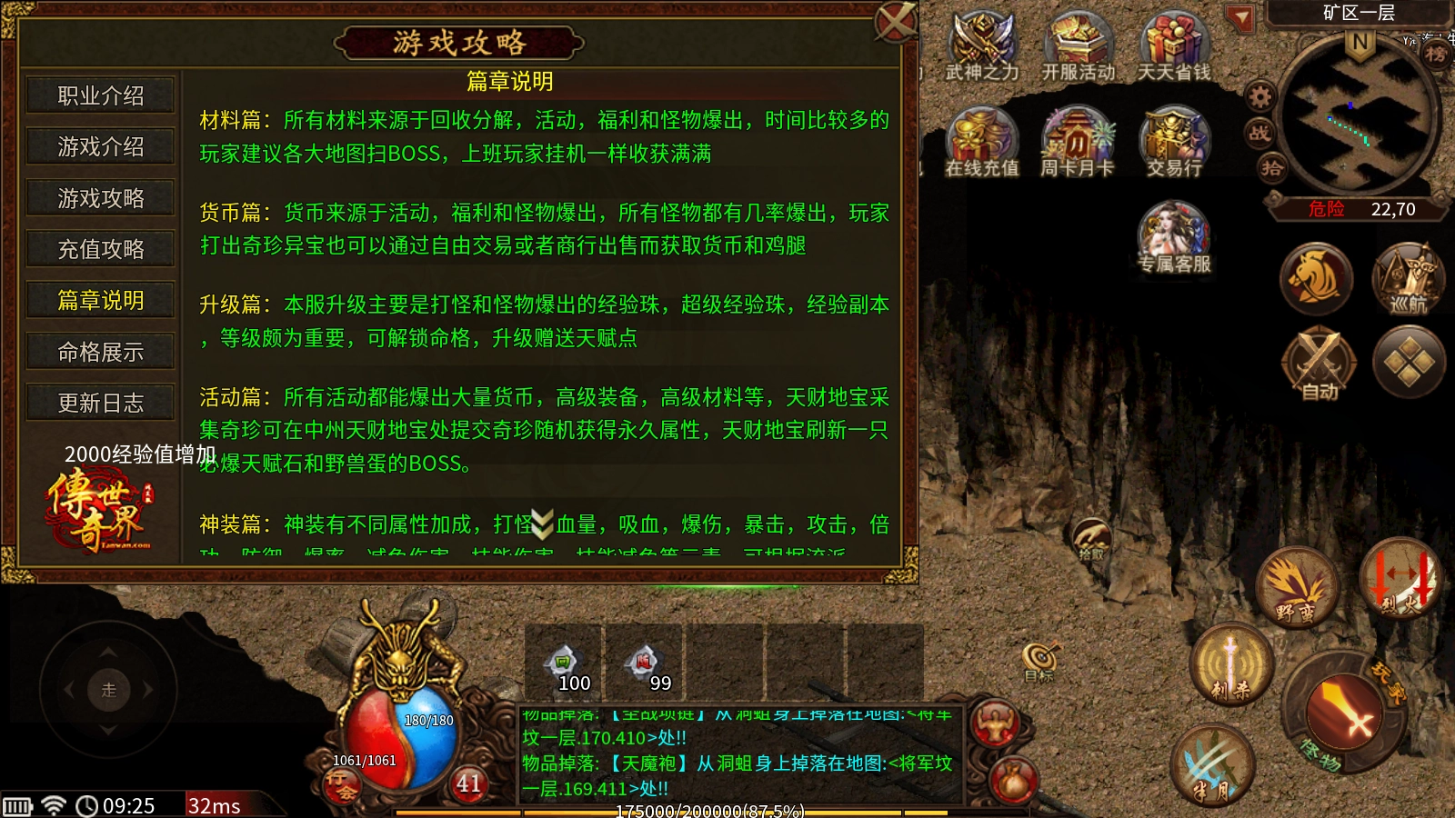 4、拿到杀怪的福利奖励后就能回城提升自己,前期除了橙色BOSS对新手来说比较难打之外,其他BOSS都可以击杀(前期玩家打出元宝的话,建议优先用于特殊升级)。