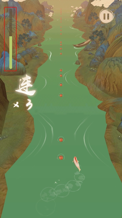 4、主鱼公会沿着河道一路前行,前进和摆动都会消耗体力,体力耗尽就会通关失败。我们得操控小鱼左右穿梭,收集河道中间按节奏点排列、疏密不一的一排沙棠果来补充体力。