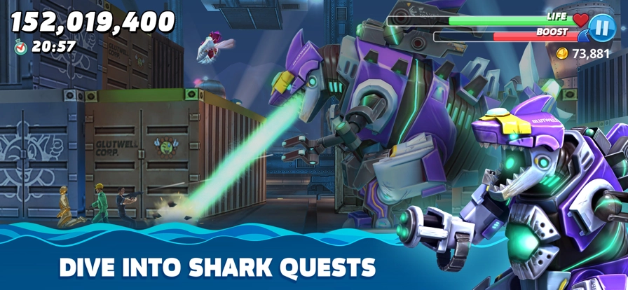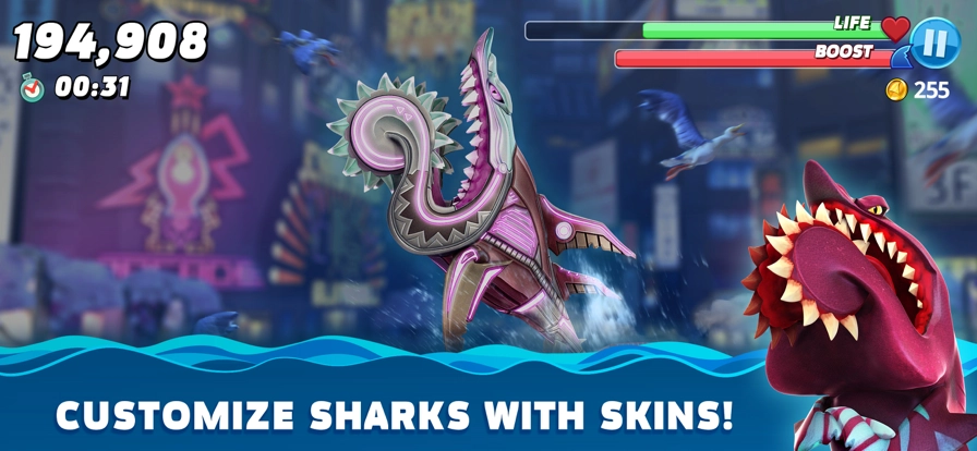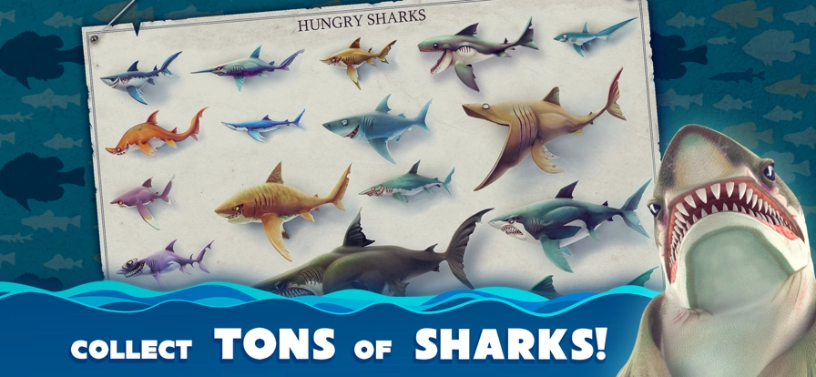 1、游戏里有多种大型鲨鱼可供玩家挑选使用,还有丰富多样的装备能让玩家自由搭配,以此打造出风格各异的鲨鱼。