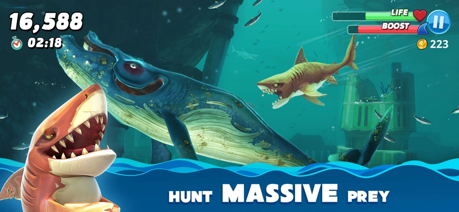 和《饥饿鲨进化》类似,都是通过逐步积累金钱来解锁更强大的鲨鱼;不过这款游戏里的鲨鱼种类更丰富,地图也更广阔,后期还加入了带特异技能的基因变异鲨鱼,我挺喜欢这种设定,玩到后期体验特别畅快。