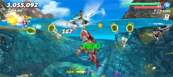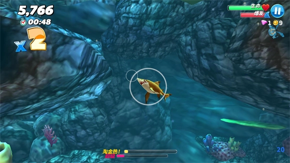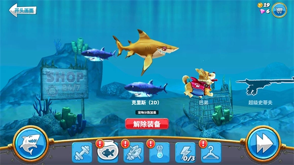 3、建议用赠送的狂暴鲨群来刷钱,不然最右边的洞穴可能进不去,而且攒下的钱尽量别乱花,钻石优先买火箭包,金币优先攒着解锁顶级鲨鱼。