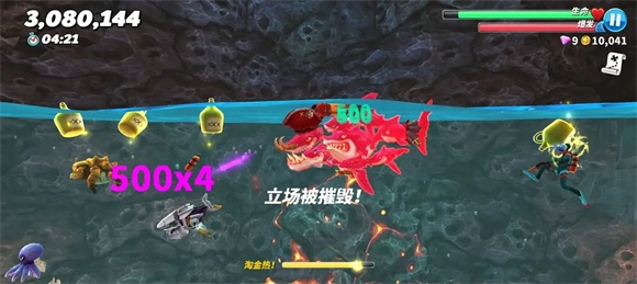 3、朝着弱点发起冲刺攻击。一旦攻击成功,螃蟹就会暂时逃走,这时候我们的鲨鱼可以趁机去周围捕食进食,不过要记得马上回来(注意别离开洞穴)。这样循环几次,就能击败巨型螃蟹了。