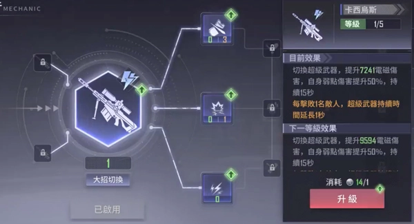 雷属性。 提升电磁伤害,弱点伤害增加50%,每击败一名敌人,超级武器的持续时间延长1秒。