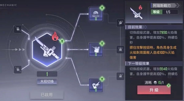 火属性。 自身护甲提升100%,效果持续15秒,需长按攻击键触发。