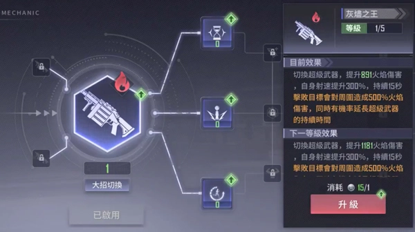 火属性。自身攻击速度提升300%,击败目标时会对周围造成500%的火焰伤害,并且有一定概率延长超级武器的持续时间。