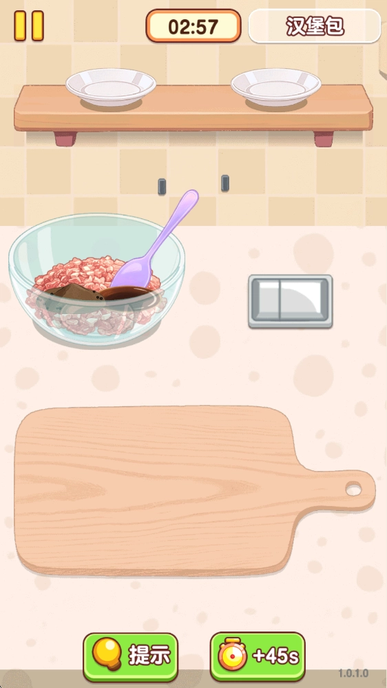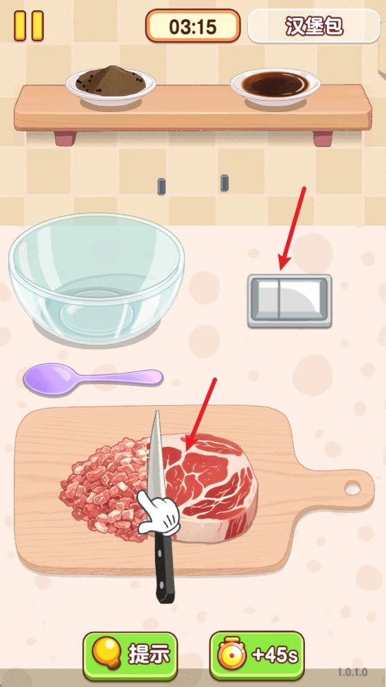 2、这一关的任务是制作汉堡包,首先得把刀磨一磨,接着把刀放到肉上点击,就能开始切割了。