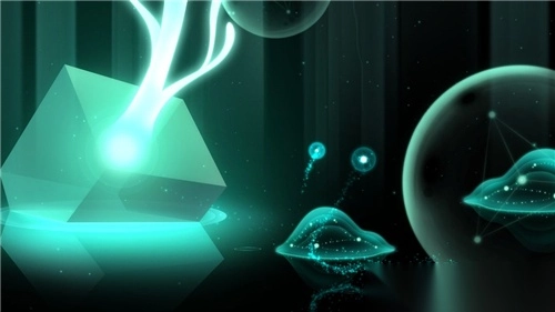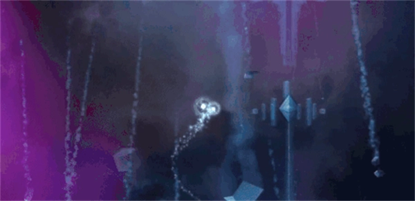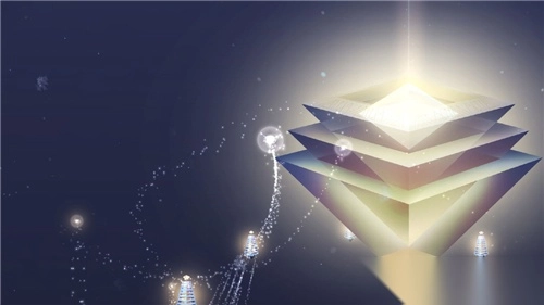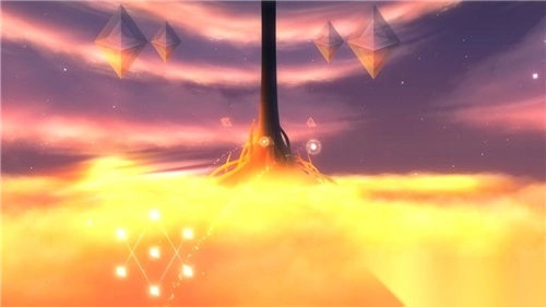 第二关的场景宛如天庭,坐落在森林上空的一片祥云之上。起初我以为和第一关一样,结果冲到顶端时却撞到了上层的云层,触发了雷电。这片区域的中央有一棵高耸入云的大树,树的周围环绕着几个符号的虚影。以这棵树为中心,空间里悬浮着几处由棱柱堆成的石堆,棱柱上分布着几个圆点,只需操控小球靠近,将棱柱上所有的圆点都点亮即可。每当一处棱柱被点亮,树周围对应的符号就会亮起,我记得总共有六个符号,等它们全部被点亮,就能顺利通关了。