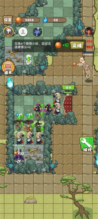 进攻类的小妖会对门外进攻的唐僧造成伤害。消耗灵石建造或升级掷骨小妖,能提升对唐僧的伤害。