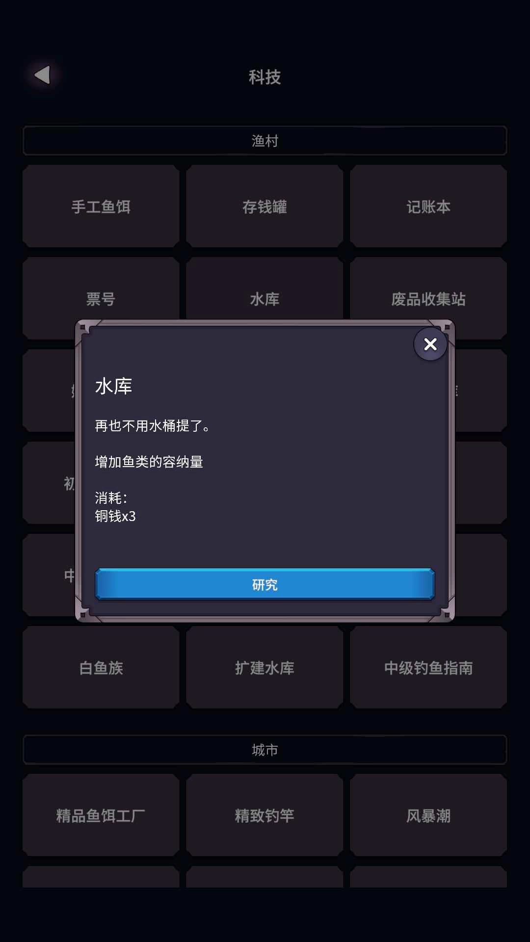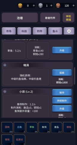 2、优先在市场兑换铜钱,随后进行科技升级,建议第一时间研究钓竿,以此提升后续效率。