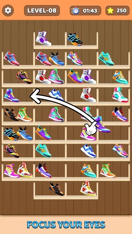 【鞋子分类(ShoeSort)】这是一款围绕鞋子展开的分类类应用。在使用过程中,你可以持续收集不同款式的鞋子,对它们进行分类整理并加以比较,从而逐步提高自身的鞋子鉴赏水平与时尚审美能力。应用的画面制作精良,涵盖的鞋子种类十分多样,无论是传统的皮鞋、实用的运动鞋,还是潮流的凉鞋、优雅的高跟鞋,都能在这里找到。当你按照正确的类别将鞋子收纳好后,还能通过合并的方式解锁新的鞋子款式呢。