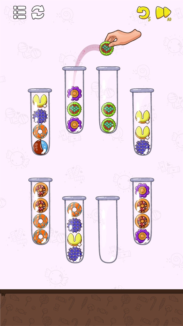 排列曲奇是个有趣又具挑战性的游戏,设计简洁。玩家需拖动饼干,把试管里的饼干准确放到对应试管中。其实核心玩法就是对不同饼干进行分类。不过游戏有时间限制,大家得留意剩余时间,在规定时间内完成分类。