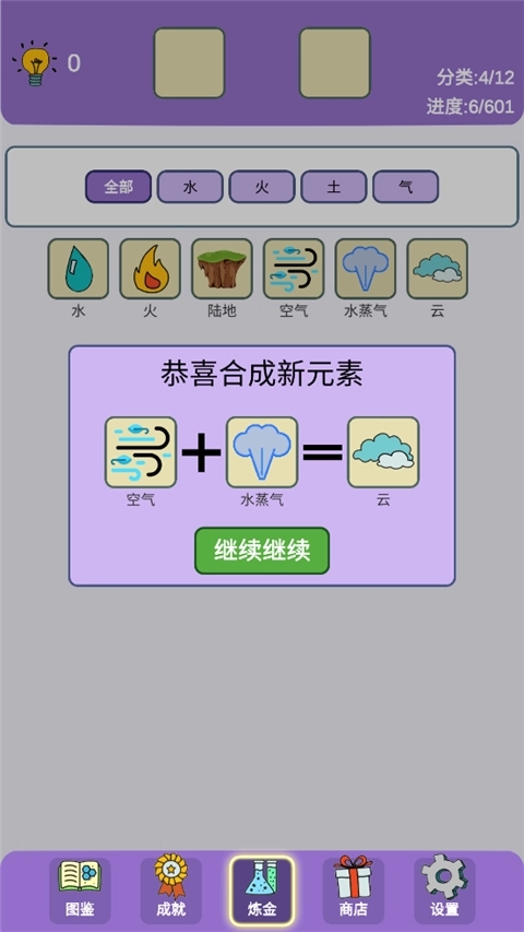 3、持续组合生成新的元素,接着把这些新元素两两合成其他元素,以此探索炼金的奥秘。