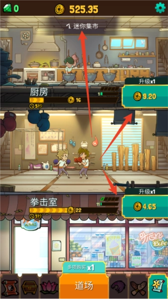 3、接着持续点击,建造规模更大、设施更完善的房间,培训学生们,同时招募武术大师来协助。