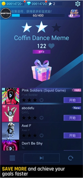 4、奖励机制:玩家在游戏中通过成功击中钢琴块来达成挑战目标,可获取金币与钻石这两种奖励资源,这些资源能用于解锁更多的关卡内容以及音乐曲目。