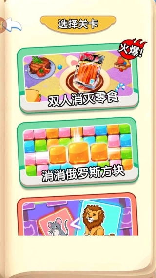 进入后,第一步是选择关卡,比如双人消灭零食、消消俄罗斯方块这类。
