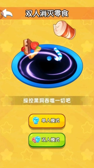 1、核心玩法是双人黑洞吞噬,两名玩家在城市场景里进行吞噬零食的较量,通过不断吞噬实现自身进化,营造出紧张又欢乐的对抗氛围。