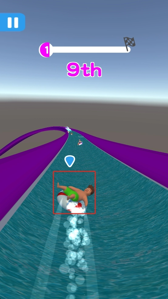 在滑行时,你要控制红框内橡皮艇上的角色,通过左右移动避开前方的对手,借助滑道的弧度保持速度,努力提升自己的当前排名。