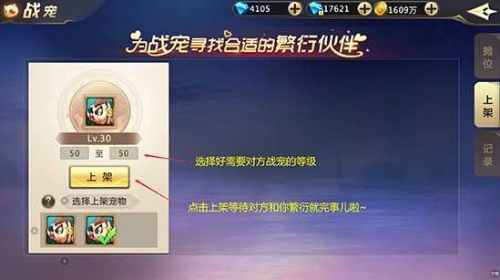 刚才我们聊到了两只宠物如何自行繁衍,不过要是只有一只宠物该怎么处理呢?别担心,看到上面那张图里的繁衍大厅了吗?大家可以把自己等级达到三十级的战宠上架,或者直接让自己的战宠和其他玩家的战宠配对(一定要记住,双方战宠等级总和达到100级,才有机会得到最高级别的战宠哦!!)具体操作就像下面这张图展示的那样: