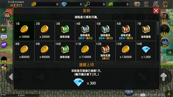 1、打开后,每天进入都能领取签到奖励,持续签到还能获得丰厚的金币、钻石、服装、技能以及武器奖励。