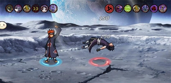 3、二技能“神罗天征”,短按触发小范围神罗天征攻击,长按则释放中等范围的神罗天征持续攻击,超长按会使自身浮空并释放大范围神罗天征继续攻击。该技能可在空中使用,当一技能超长按处于抓取对方的状态时,释放二技能能够延长黑棒的抓取时长。此外,在二技能超长按释放后点击一技能,会触发“地爆天星”。