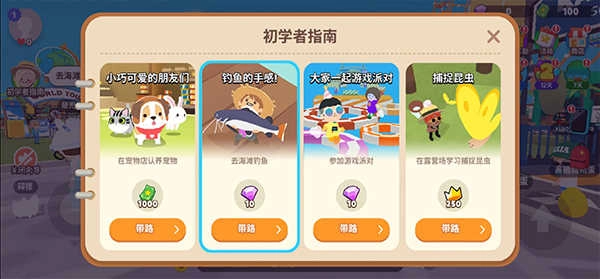 2、点开之后会出现一个初学者任务指南,我们选择第二个关于钓鱼手感的选项,然后点击下方的“带路”按钮。