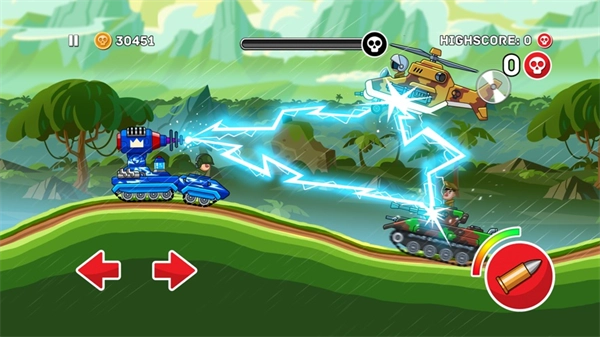 就像图中的坦克一样,主炮可以打击前方的敌人,火箭能够对付后方的敌人,在敌人刚冒头时就把它们消灭掉,这样坦克的上方就全是开阔的天空,我们就能轻松通过关卡了。