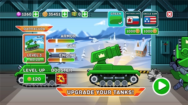 为了满足更多玩家的需求,游戏还提供了多种坦克可供解锁,玩家也可以对每辆坦克进行升级强化,提升各项属性。升级后的坦克能让你充分体验到秒杀敌人的快感。