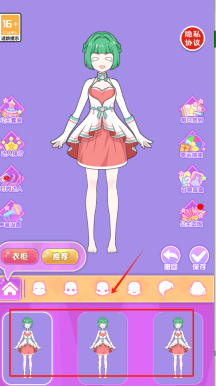 2、选择绿头发的女孩,从左侧挑选公主套装,在右侧进行设置,于下方调整发型和眼睛,之后保存即可。