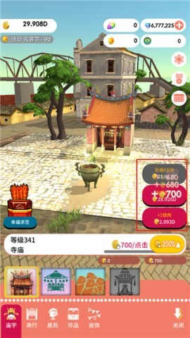 当积攒够充足的资金后,就能对寺庙展开升级操作,以此提高金钱的获取效率。