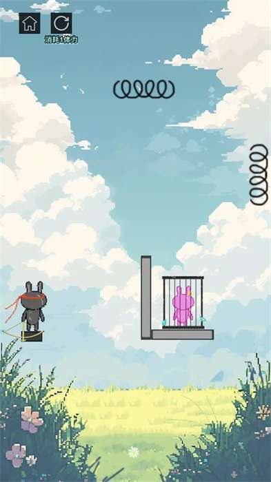 解救哭哭兔:长按屏幕滑动调整弓箭角度,松开手指射出弓箭,击碎铁笼即可完成救援。
