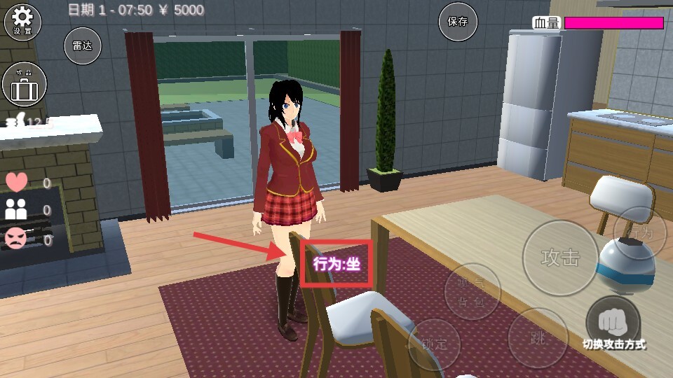 3、当在房间里靠近椅子时,会弹出【行为-坐】的提示,点击该提示就能让人物做出坐下的动作。