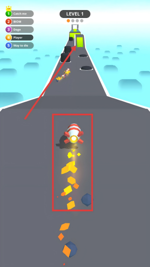 2、操控火箭前进,击碎路上的方块获取道具,同时避开黑色障碍物,保持前进节奏。