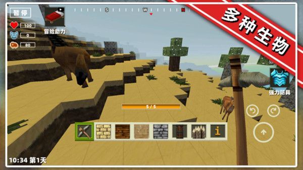 开放像素方块世界游戏创新性地将像素艺术的清新风格与沙盒游戏的自由度相结合,且在这个虚拟的沙盒世界里,有着多样的地图,还有多种不同的沙盒生物,需要玩家自行驯服,装点你的沙盒世界。