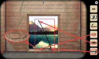 5、锈湖视角:把(鱼竿)放置到鱼竿架上,连接好(鱼线),再在鱼线上系上(鱼钩)。
