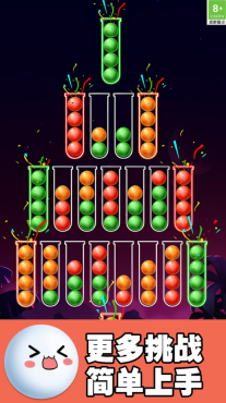 2、随着关卡的提升,试管的数量与小球的颜色种类会逐步增多,以此来考验玩家的观察能力与规划能力。