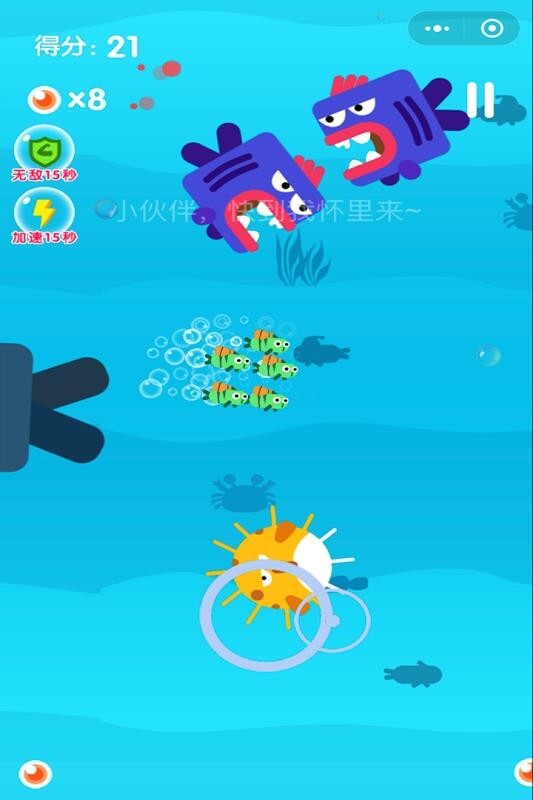 挑战中的你要时时刻刻注意有没有大鱼在旁边等待出击伤害小青鱼,是一部充满休闲元素的游戏,你要设身处地的体验简单且易于上手的内容。