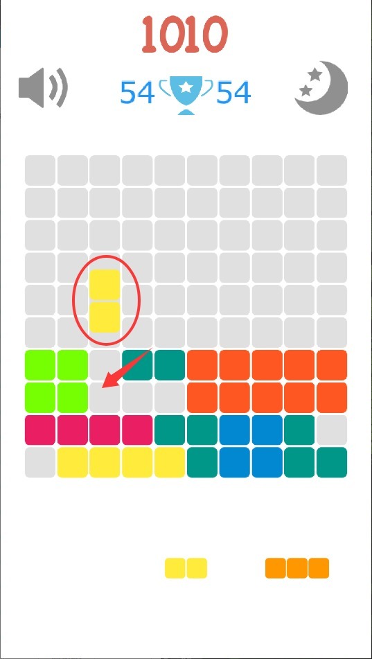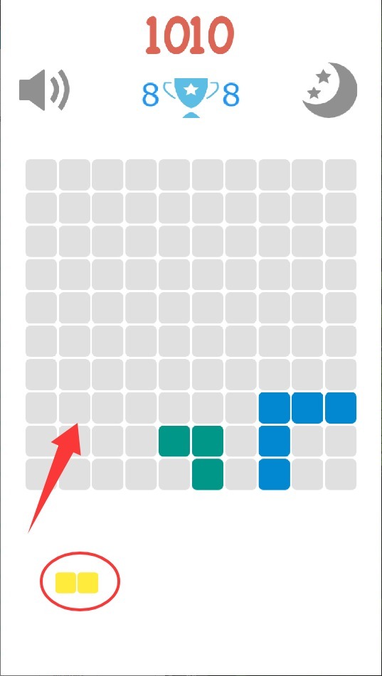 2、用手指滑动操作,把底部的方块拖到上方的网格区域里,要留意合理安排摆放的位置,给后面要放置的方块留出空间。