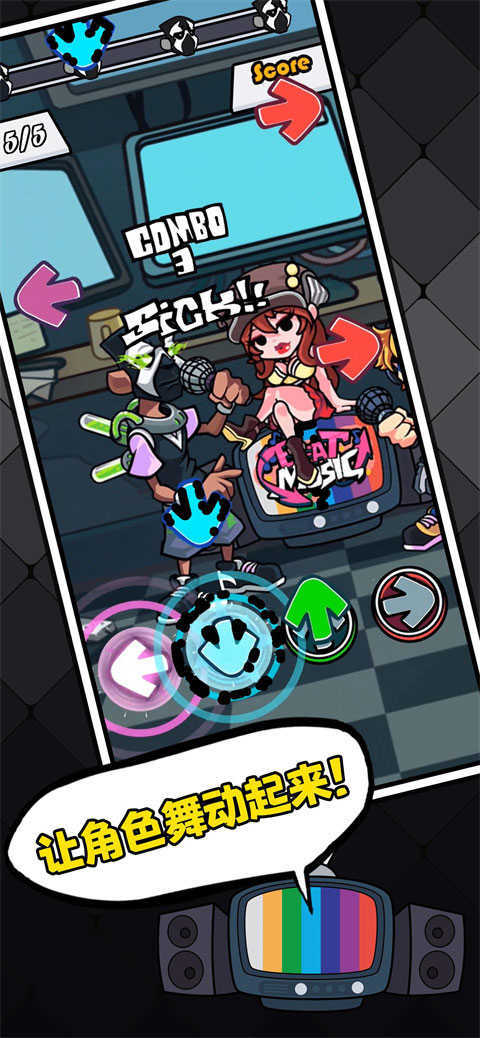 2、音符下落与精准点击 在游戏进行时,音符会跟随音乐的节奏从屏幕顶部慢慢下落,玩家要依据音符下方箭头的指引,快速点击屏幕底部对应的箭头区域。每一次成功命中音符,系统都会给出“Sick”的判定提示。