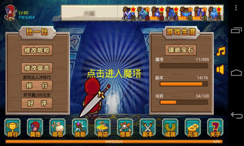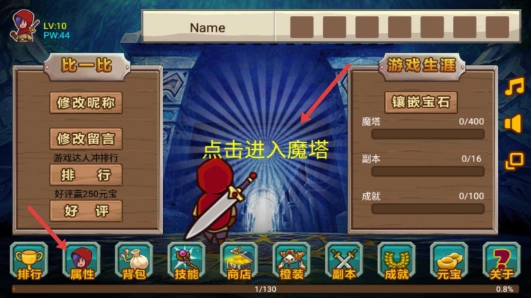 1、界面会显示“点击进入魔塔”的提示,你可以先通过属性等功能按钮查看角色当前状态,之后再点击进入魔塔,开启属于你的魔塔挑战之旅。
